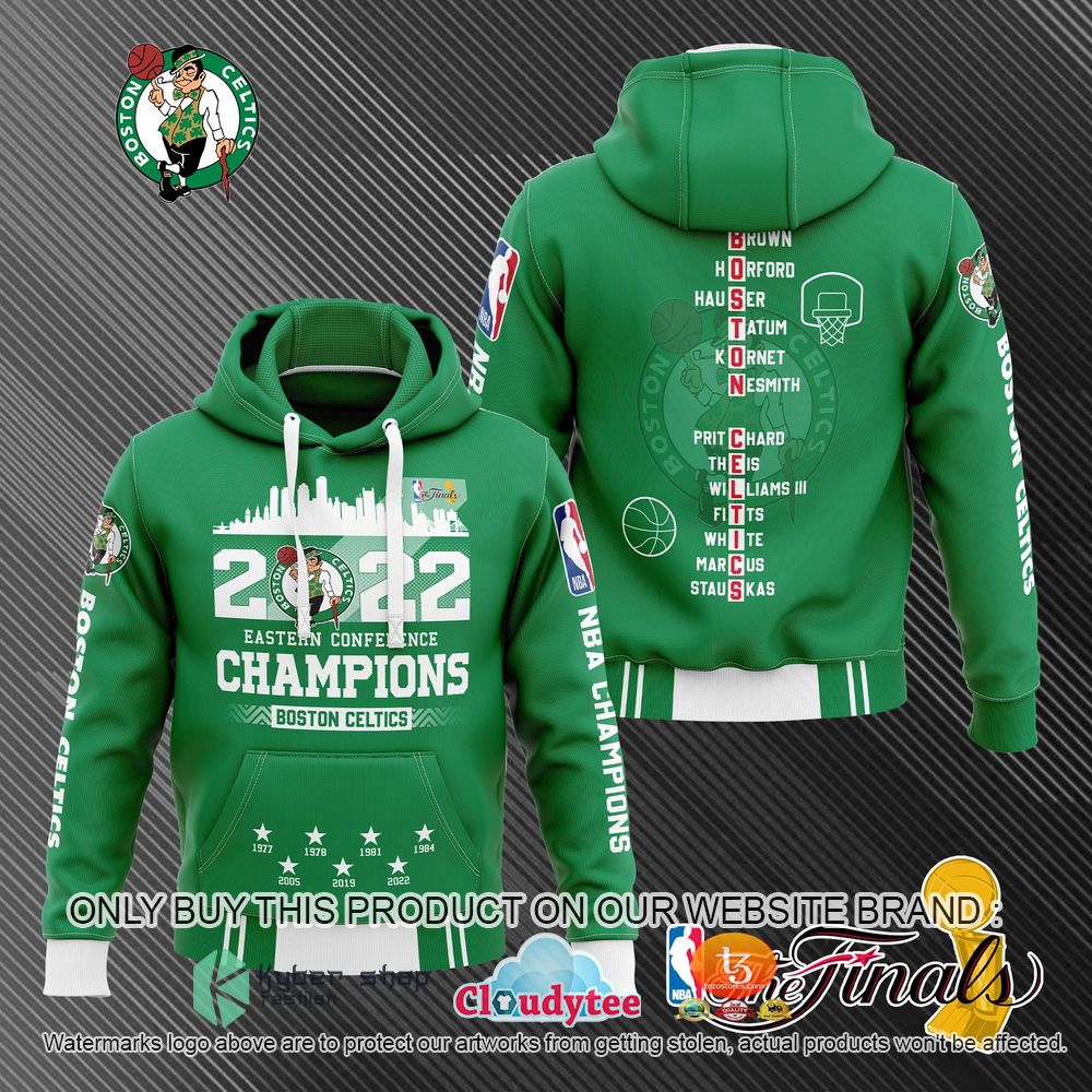NBA Boston Celtics Green Champions 2022 Pullover Hoodie Product Features Along with its Boston Celtics graphics, this cozy pullover hoodie features super-soft midweight material. Material: 95% polyester + 5% spandex. The fabric is durable and resistant to wrinkles, shrinking and mildew. Hood with drawstrings. Long sleeve. Front pouch pocket. Midweight hoodie suitable for moderate temperatures....