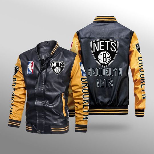 NBA Brooklyn Nets Black Yellow Leather Bomber Jacket
