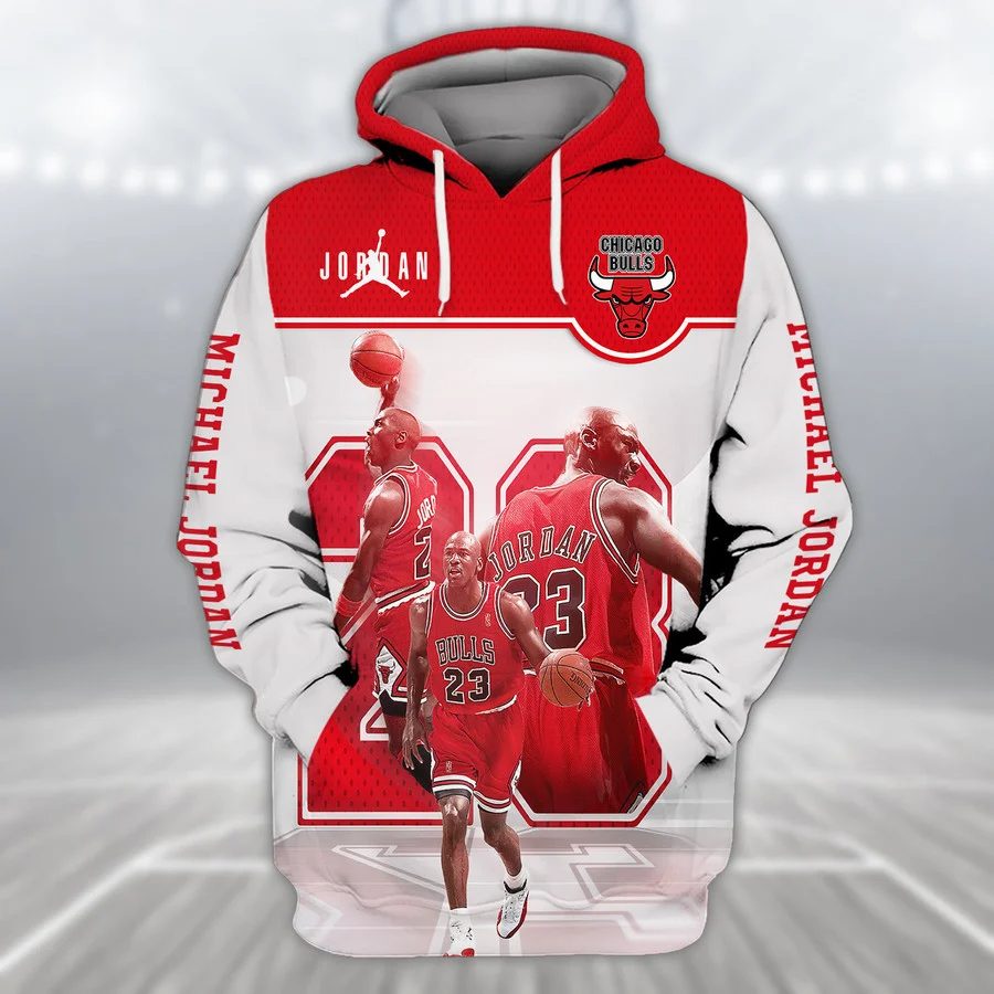 NBA Chicago Bulls Michael Jordan White Red Pullover Hoodie Product Features Along with its Chicago Bulls graphics, this cozy pullover hoodie features super-soft midweight material. Material: 95% polyester + 5% spandex. The fabric is durable and resistant to wrinkles, shrinking and mildew. Hood with drawstrings. Long sleeve. Front pouch pocket. Midweight hoodie suitable for moderate...