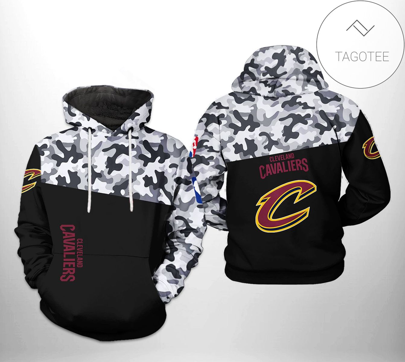 NBA Cleveland Cavaliers Black White Camo Pullover Hoodie Product Features Along with its Cleveland Cavaliers graphics, this cozy pullover hoodie features super-soft midweight material. Material: 95% polyester + 5% spandex. The fabric is durable and resistant to wrinkles, shrinking and mildew. Hood with drawstrings. Long sleeve. Front pouch pocket. Midweight hoodie suitable for moderate temperatures....