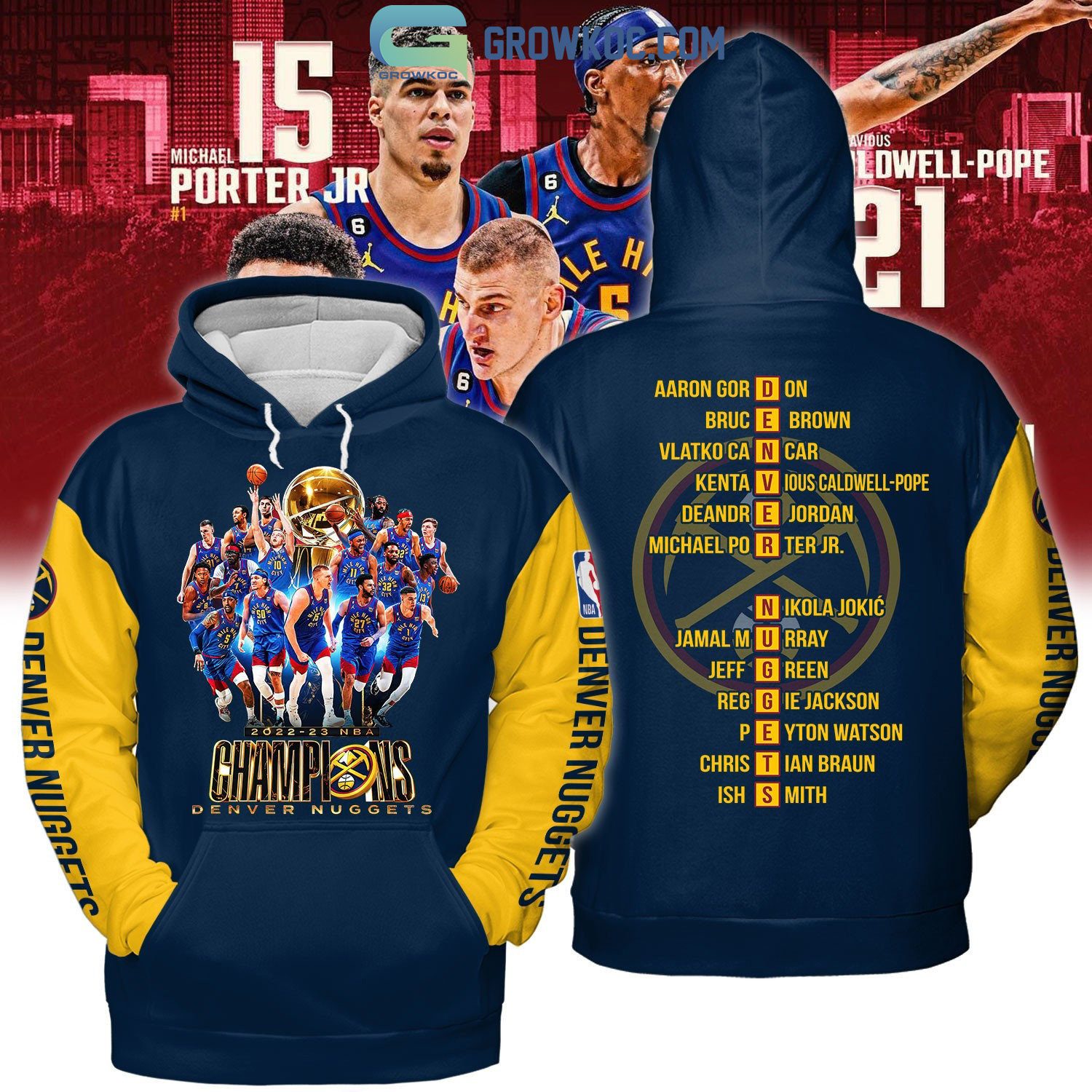 NBA Denver Nuggets Navy 2023 Champions Pullover Hoodie Product Features Along with its Denver Nuggets graphics, this cozy pullover hoodie features super-soft midweight material. Material: 95% polyester + 5% spandex. The fabric is durable and resistant to wrinkles, shrinking and mildew. Hood with drawstrings. Long sleeve. Front pouch pocket. Midweight hoodie suitable for moderate temperatures....