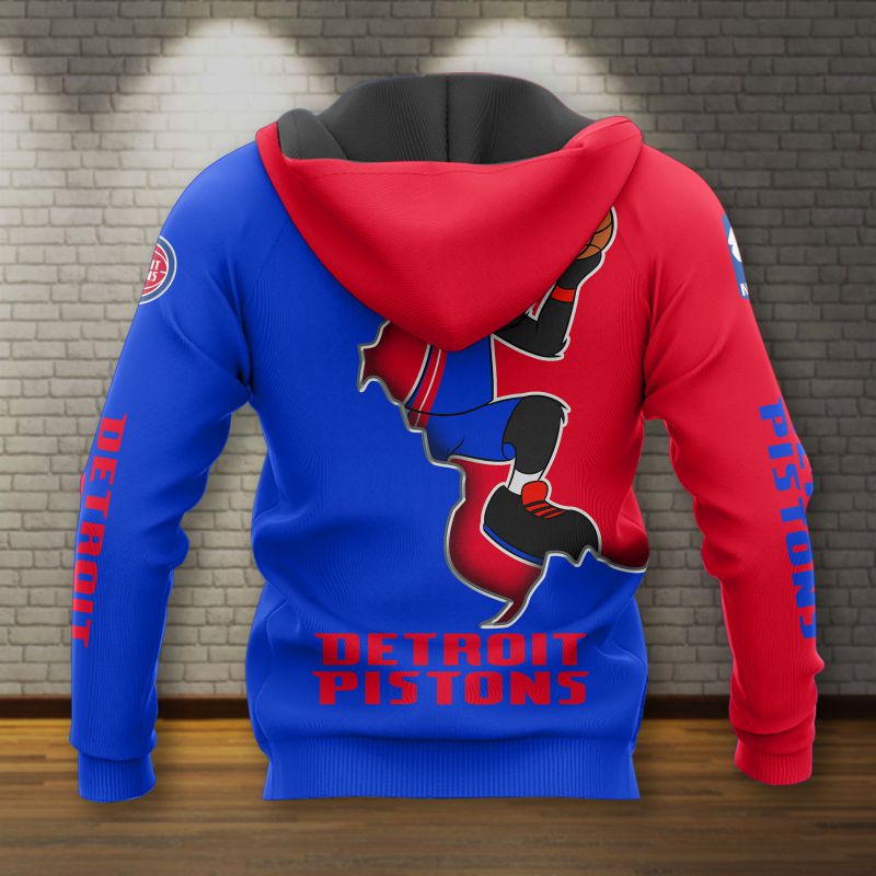NBA Detroit Pistons Red Blue Mascot Scratch Pullover Hoodie Product Features Along with its Detroit Pistons graphics, this cozy pullover hoodie features super-soft midweight material. Material: 95% polyester + 5% spandex. The fabric is durable and resistant to wrinkles, shrinking and mildew. Hood with drawstrings. Long sleeve. Front pouch pocket. Midweight hoodie suitable for moderate...