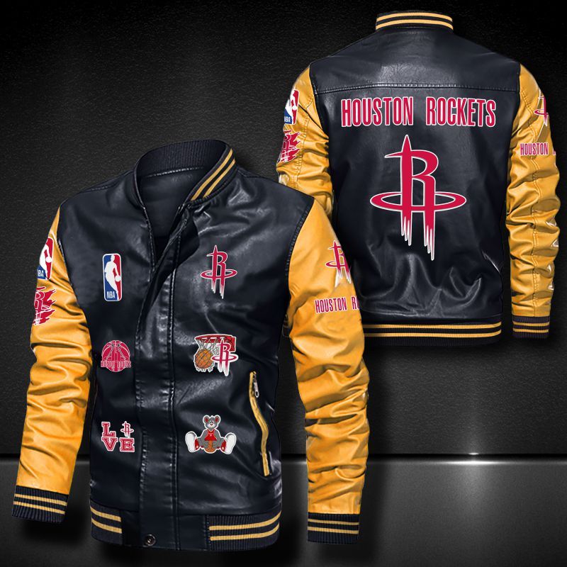 NBA Houston Rockets Black Yellow Logo Team Leather Bomber Jacket