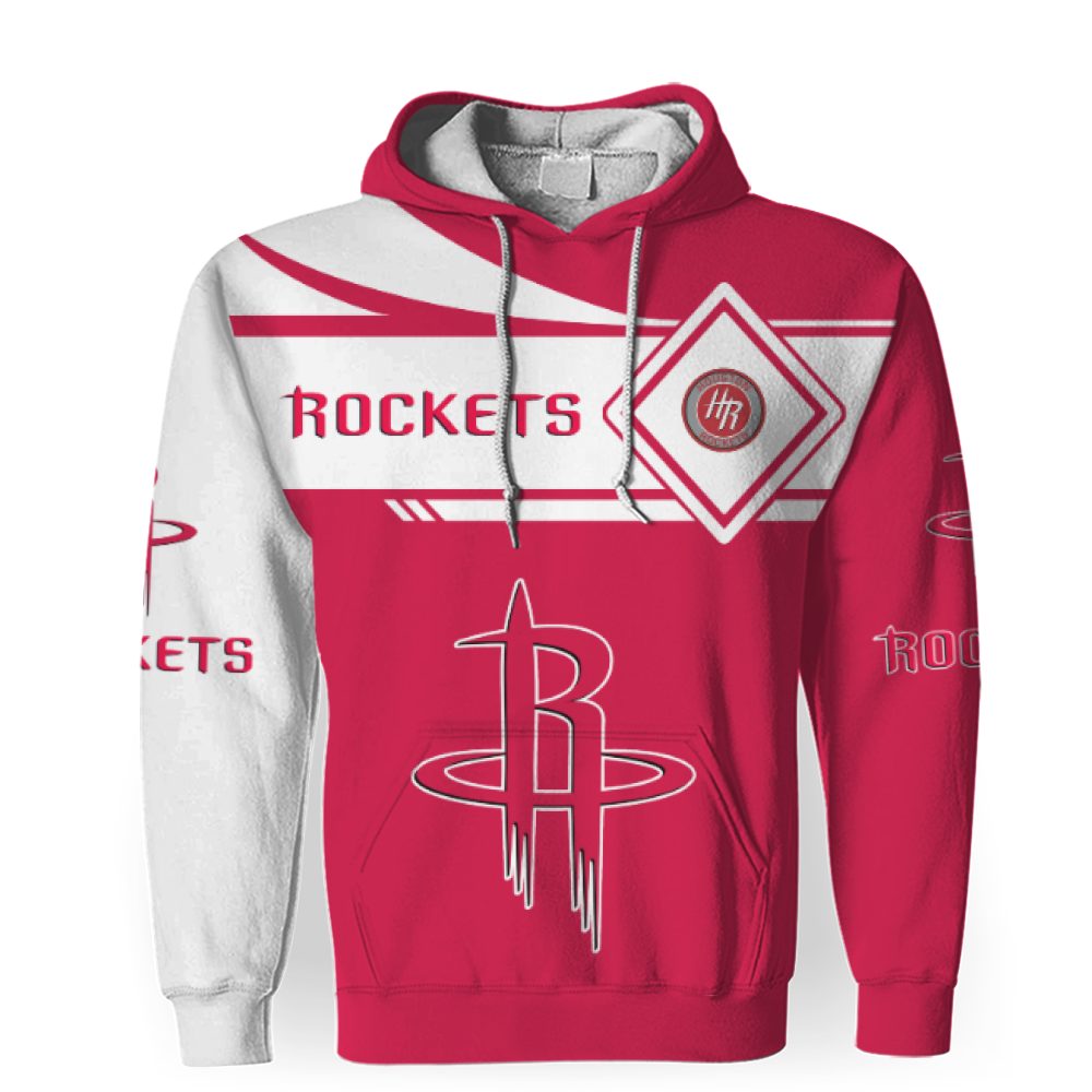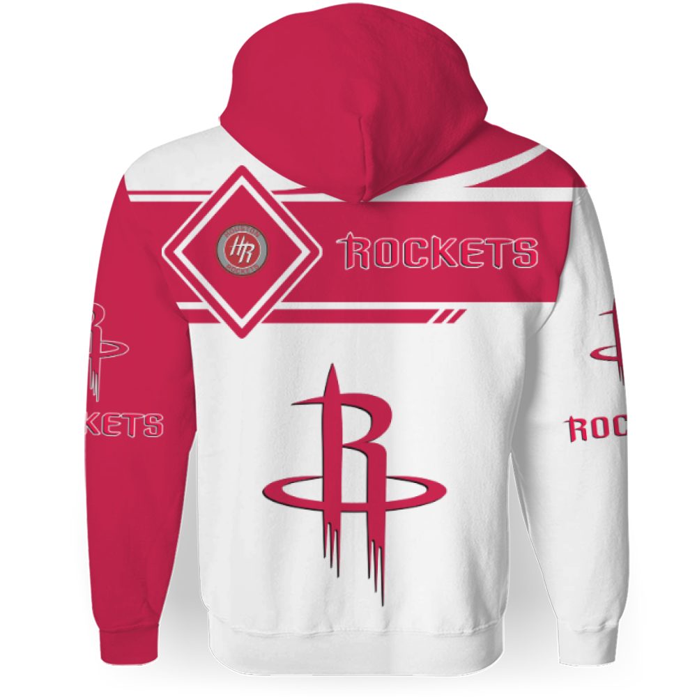 NBA Houston Rockets White Red Pullover Hoodie V3 Product Features Along with its Houston Rockets graphics, this cozy pullover hoodie features super-soft midweight material. Material: 95% polyester + 5% spandex. The fabric is durable and resistant to wrinkles, shrinking and mildew. Hood with drawstrings. Long sleeve. Front pouch pocket. Midweight hoodie suitable for moderate temperatures....