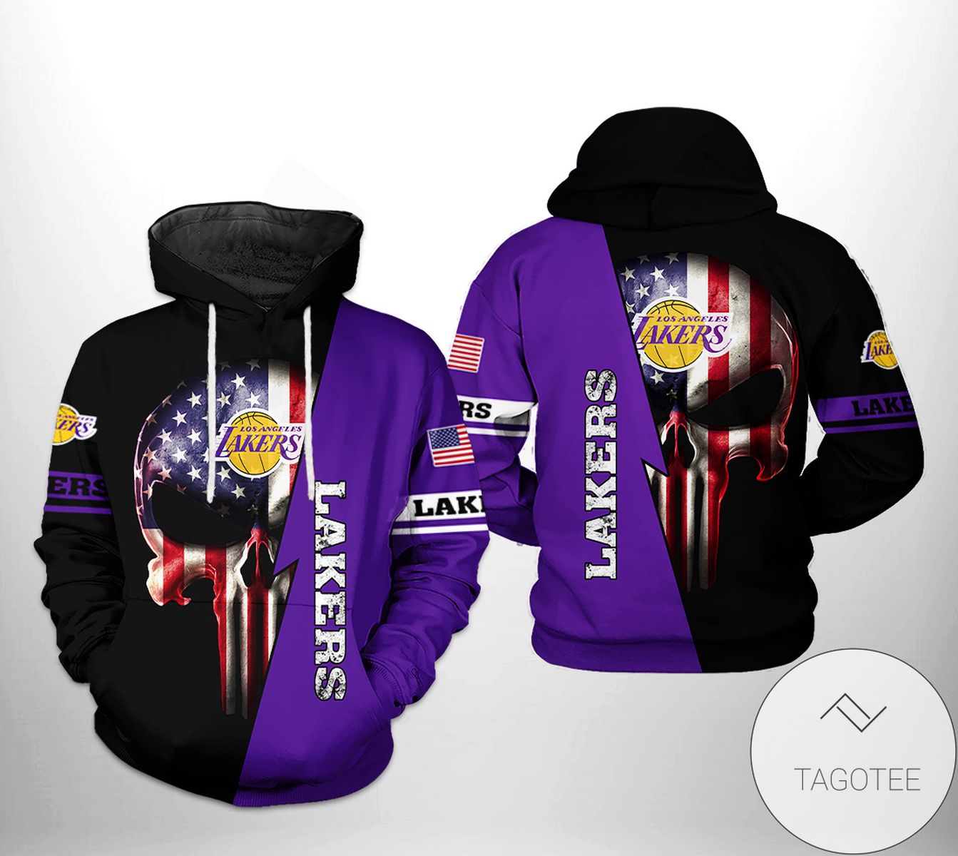 NBA Los Angeles Lakers US Flag Punisher Skull Pullover Hoodie Product Features Along with its Los Angeles Lakers graphics, this cozy pullover hoodie features super-soft midweight material. Material: 95% polyester + 5% spandex. The fabric is durable and resistant to wrinkles, shrinking and mildew. Hood with drawstrings. Long sleeve. Front pouch pocket. Midweight hoodie suitable...