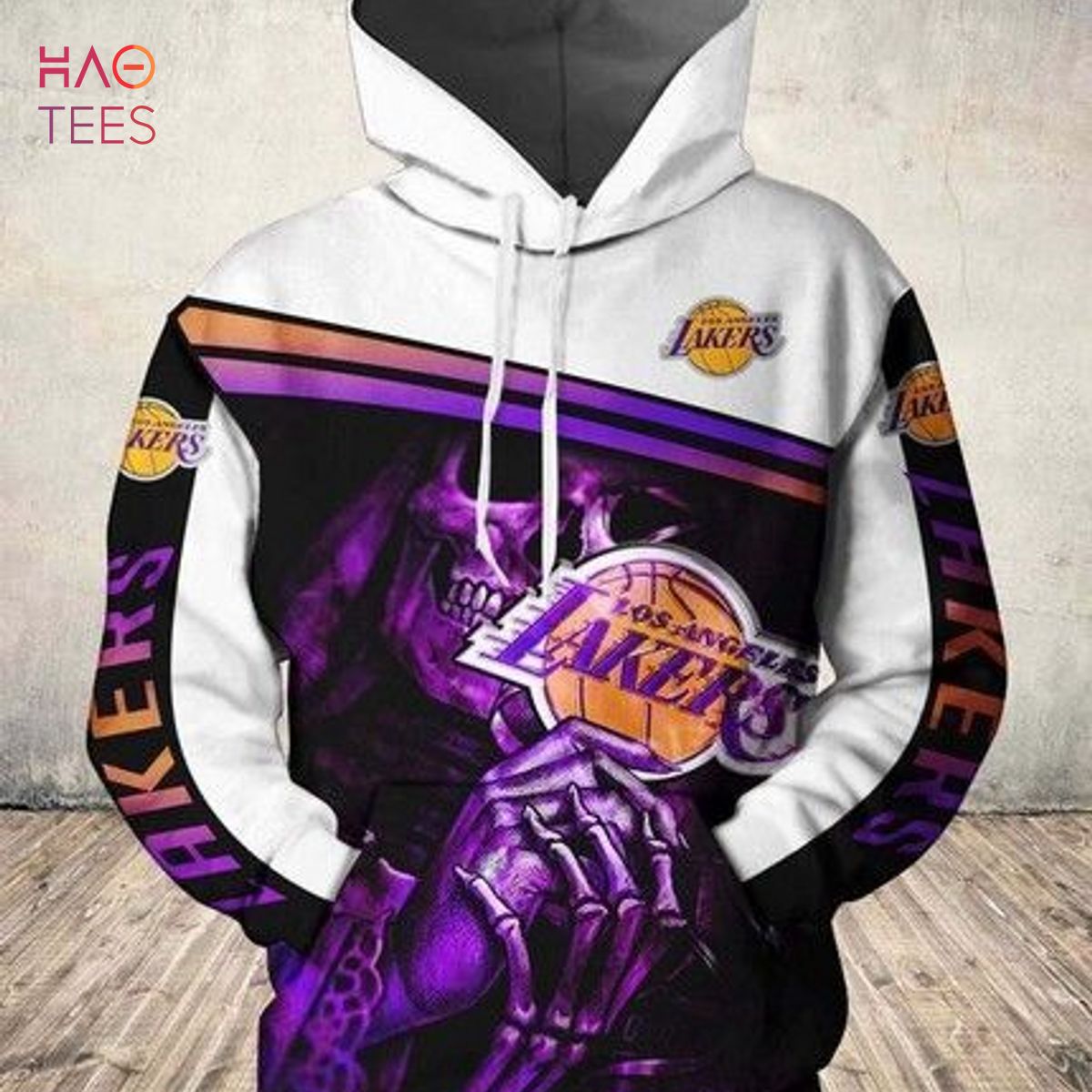 NBA Los Angeles Lakers White Purple Skull Pullover Hoodie V5 Product Features Along with its Los Angeles Lakers graphics, this cozy pullover hoodie features super-soft midweight material. Material: 95% polyester + 5% spandex. The fabric is durable and resistant to wrinkles, shrinking and mildew. Hood with drawstrings. Long sleeve. Front pouch pocket. Midweight hoodie suitable...