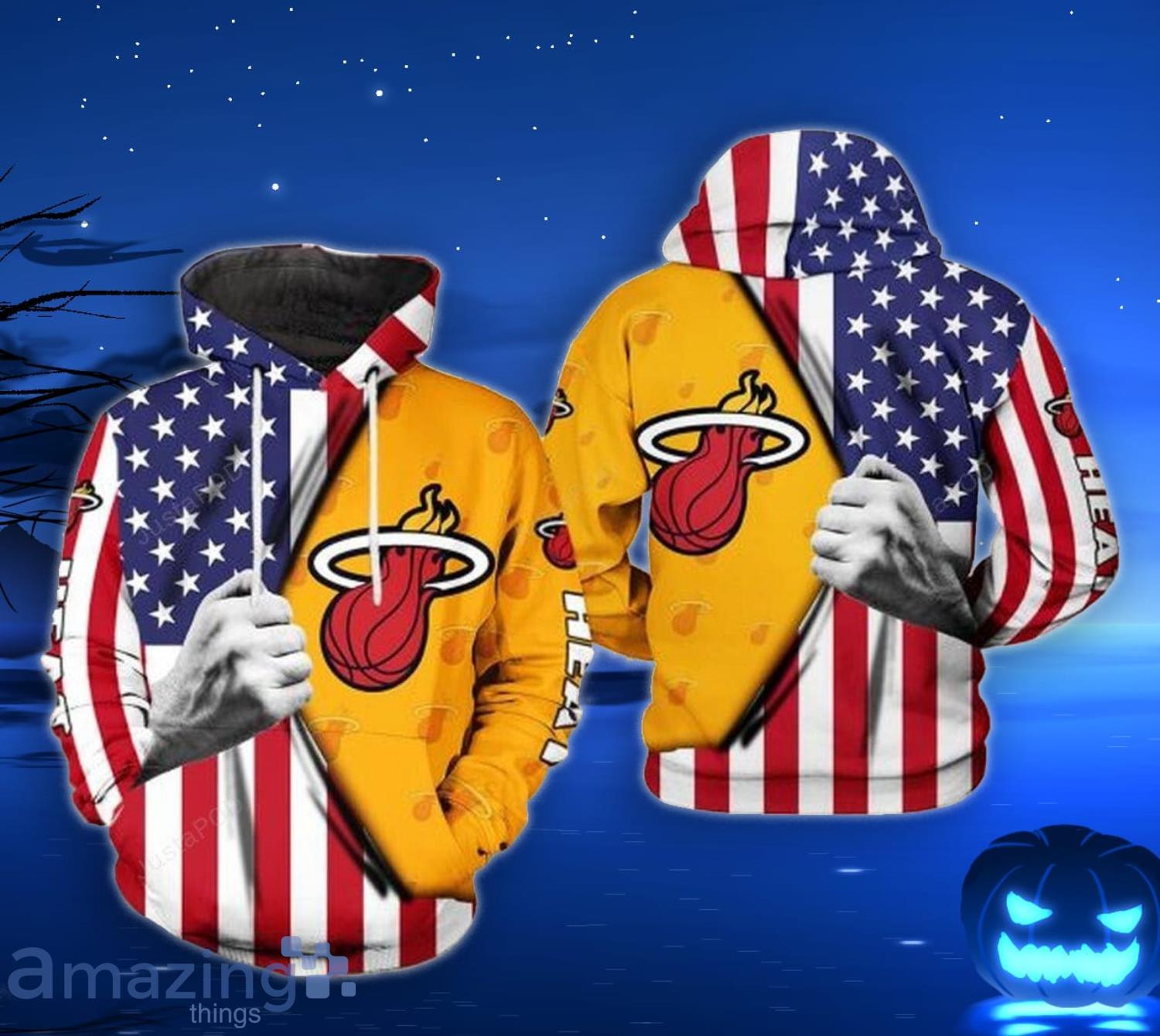 NBA Miami Heat US Flag Pullover Hoodie V2 Product Features Along with its Miami Heat graphics, this cozy pullover hoodie features super-soft midweight material. Material: 95% polyester + 5% spandex. The fabric is durable and resistant to wrinkles, shrinking and mildew. Hood with drawstrings. Long sleeve. Front pouch pocket. Midweight hoodie suitable for moderate temperatures....