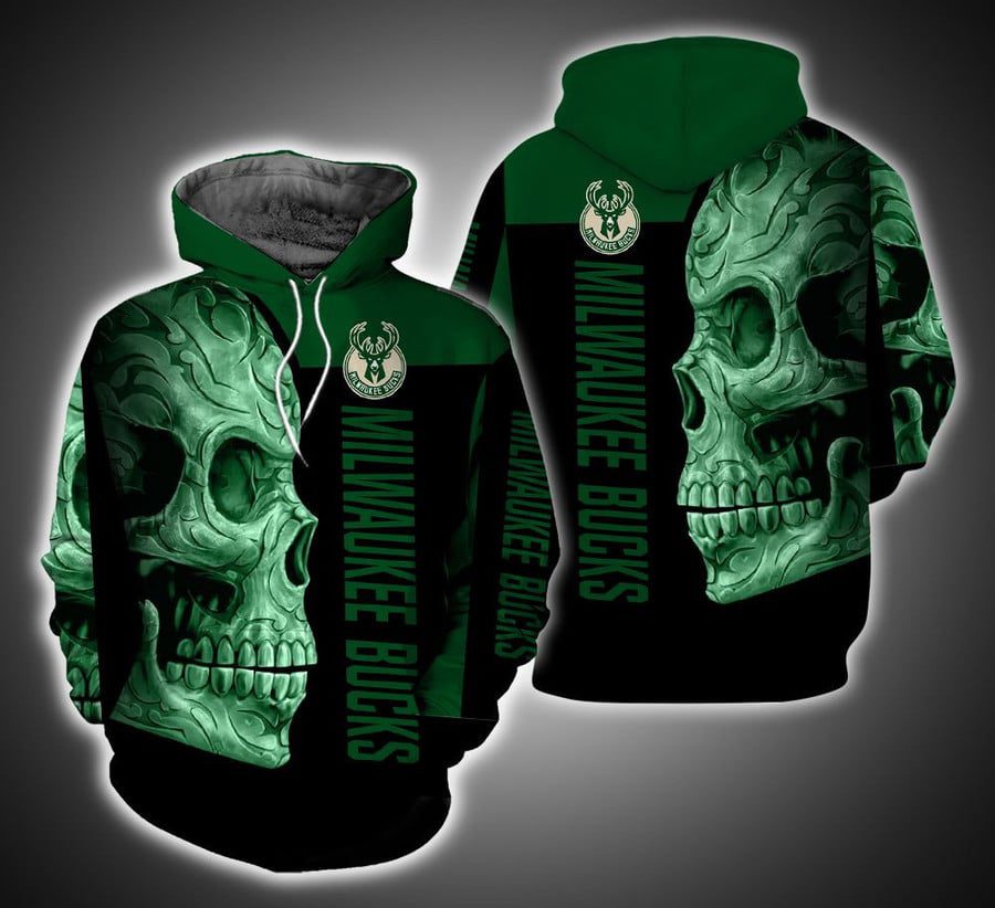 NBA Milwaukee Bucks Green Black Skull Pullover Hoodie Product Features Along with its Milwaukee Bucks graphics, this cozy pullover hoodie features super-soft midweight material. Material: 95% polyester + 5% spandex. The fabric is durable and resistant to wrinkles, shrinking and mildew. Hood with drawstrings. Long sleeve. Front pouch pocket. Midweight hoodie suitable for moderate temperatures....