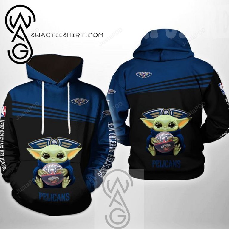 NBA New Orleans Pelicans Baby Yoda Pullover Hoodie Product Features Along with its New Orleans Pelicans graphics, this cozy pullover hoodie features super-soft midweight material. Material: 95% polyester + 5% spandex. The fabric is durable and resistant to wrinkles, shrinking and mildew. Hood with drawstrings. Long sleeve. Front pouch pocket. Midweight hoodie suitable for moderate...