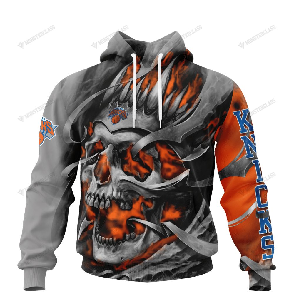 NBA New York Knicks Custom Name Number Gray Orange Skull Pullover Hoodie Product Features Along with its New York Knicks graphics, this cozy pullover hoodie features super-soft midweight material. Material: 95% polyester + 5% spandex. The fabric is durable and resistant to wrinkles, shrinking and mildew. Hood with drawstrings. Long sleeve. Front pouch pocket. Midweight...