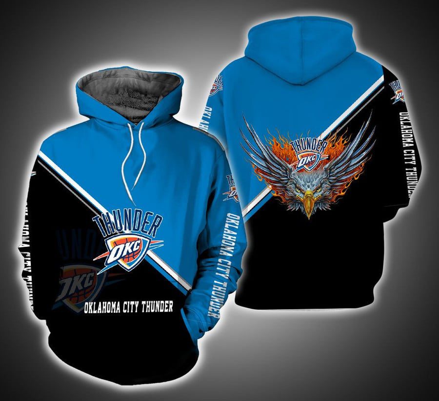 NBA Oklahoma City Thunder Black Blue Fire Eagle Pullover Hoodie Product Features Along with its Oklahoma City Thunder graphics, this cozy pullover hoodie features super-soft midweight material. Material: 95% polyester + 5% spandex. The fabric is durable and resistant to wrinkles, shrinking and mildew. Hood with drawstrings. Long sleeve. Front pouch pocket. Midweight hoodie suitable...