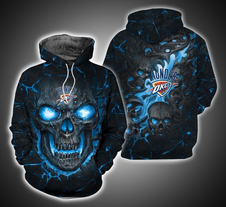 NBA Oklahoma City Thunder Black Blue Skull Pullover Hoodie Product Features Along with its Oklahoma City Thunder graphics, this cozy pullover hoodie features super-soft midweight material. Material: 95% polyester + 5% spandex. The fabric is durable and resistant to wrinkles, shrinking and mildew. Hood with drawstrings. Long sleeve. Front pouch pocket. Midweight hoodie suitable for...