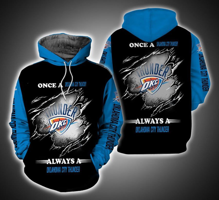 NBA Oklahoma City Thunder Blue Black Scratch For Fans Pullover Hoodie Product Features Along with its Oklahoma City Thunder graphics, this cozy pullover hoodie features super-soft midweight material. Material: 95% polyester + 5% spandex. The fabric is durable and resistant to wrinkles, shrinking and mildew. Hood with drawstrings. Long sleeve. Front pouch pocket. Midweight hoodie...
