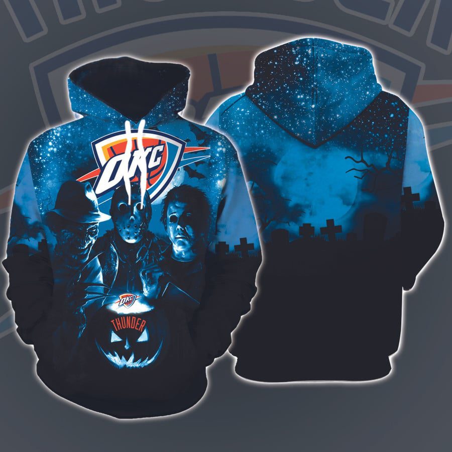 NBA Oklahoma City Thunder Halloween Michael Myers Jason Voorhees Freddy Krueger Pullover Hoodie Product Features Along with its Oklahoma City Thunder graphics, this cozy pullover hoodie features super-soft midweight material. Material: 95% polyester + 5% spandex. The fabric is durable and resistant to wrinkles, shrinking and mildew. Hood with drawstrings. Long sleeve. Front pouch pocket....