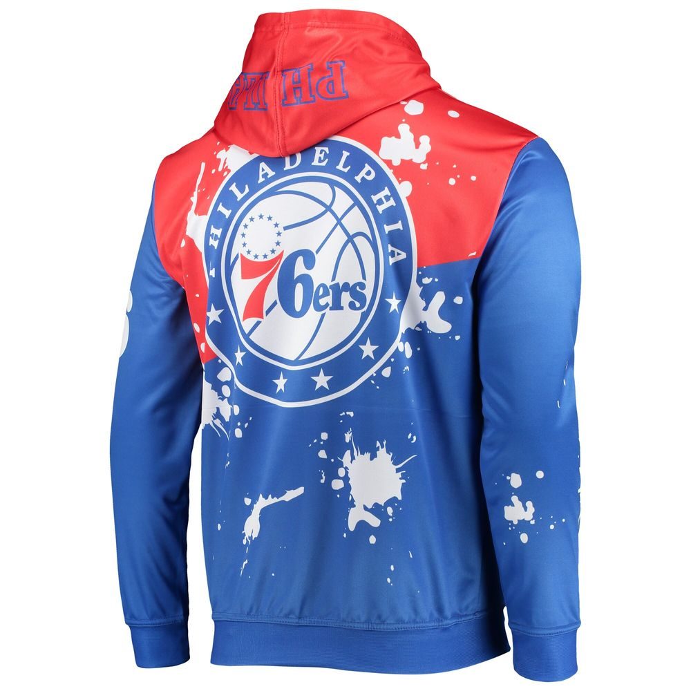NBA Philadelphia 76ers Blue Red Pullover Hoodie V6 Product Features Along with its Philadelphia 76ers graphics, this cozy pullover hoodie features super-soft midweight material. Material: 95% polyester + 5% spandex. The fabric is durable and resistant to wrinkles, shrinking and mildew. Hood with drawstrings. Long sleeve. Front pouch pocket. Midweight hoodie suitable for moderate temperatures....