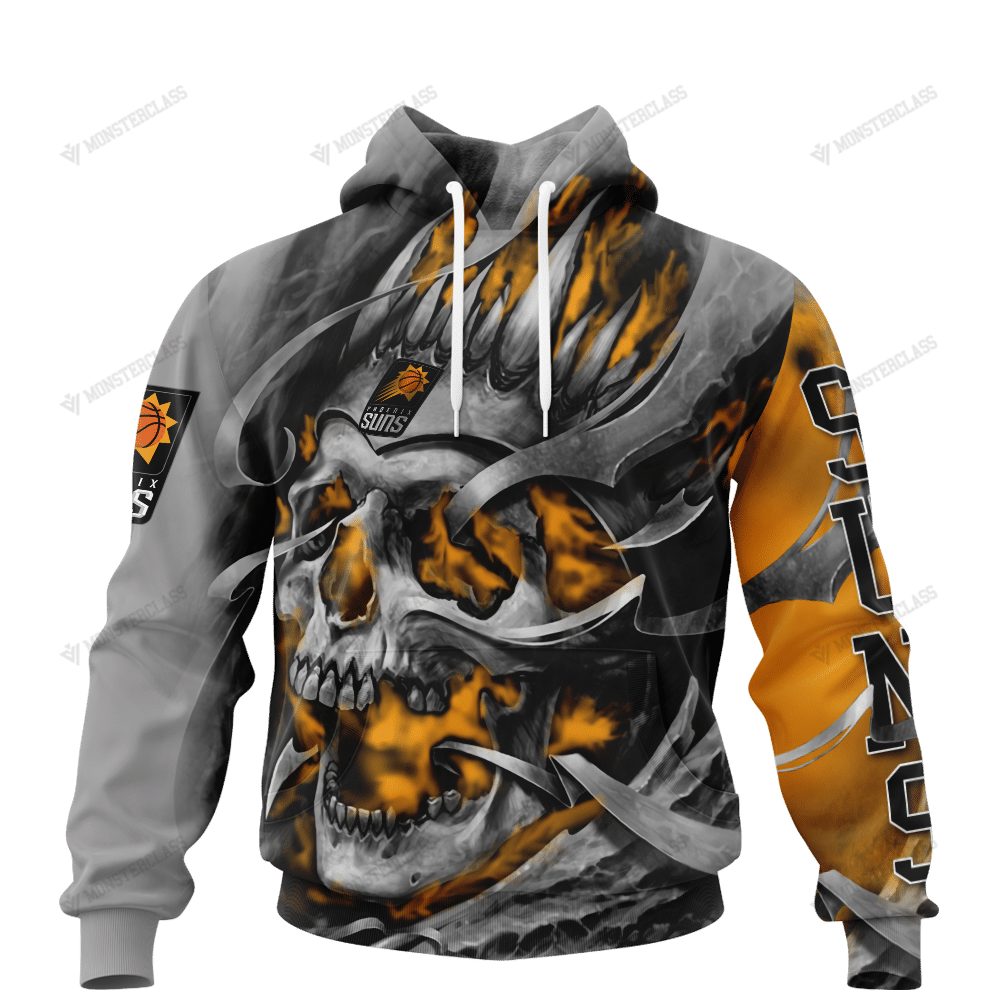 NBA Phoenix Suns Custom Name Number Gray Yellow Smoke Skull Pullover Hoodie Product Features Along with its Phoenix Suns graphics, this cozy pullover hoodie features super-soft midweight material. Material: 95% polyester + 5% spandex. The fabric is durable and resistant to wrinkles, shrinking and mildew. Hood with drawstrings. Long sleeve. Front pouch pocket. Midweight hoodie...