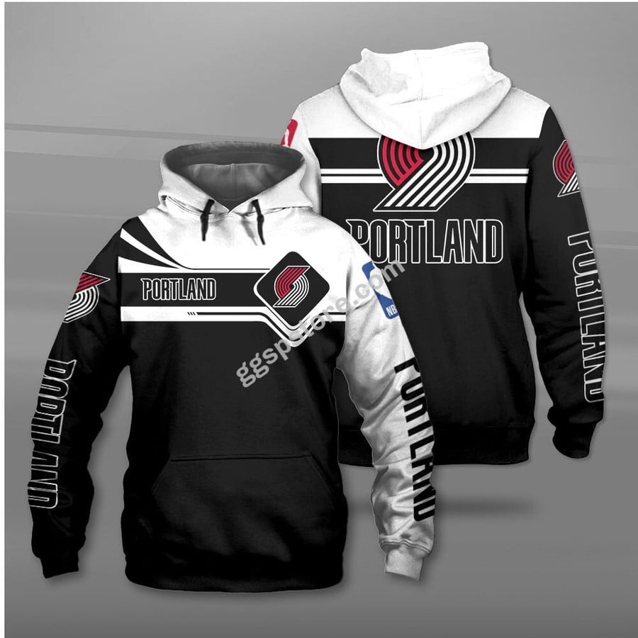 NBA Portland Trail Blazers Black White Pullover Hoodie Product Features Along with its Portland Trail Blazers graphics, this cozy pullover hoodie features super-soft midweight material. Material: 95% polyester + 5% spandex. The fabric is durable and resistant to wrinkles, shrinking and mildew. Hood with drawstrings. Long sleeve. Front pouch pocket. Midweight hoodie suitable for moderate...