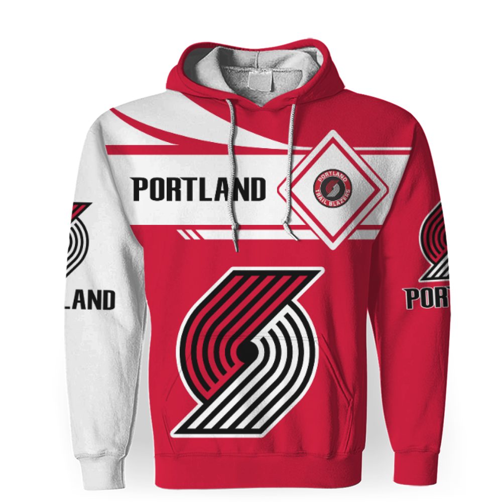 NBA Portland Trail Blazers Red White Pullover Hoodie V11 Product Features Along with its Portland Trail Blazers graphics, this cozy pullover hoodie features super-soft midweight material. Material: 95% polyester + 5% spandex. The fabric is durable and resistant to wrinkles, shrinking and mildew. Hood with drawstrings. Long sleeve. Front pouch pocket. Midweight hoodie suitable for...