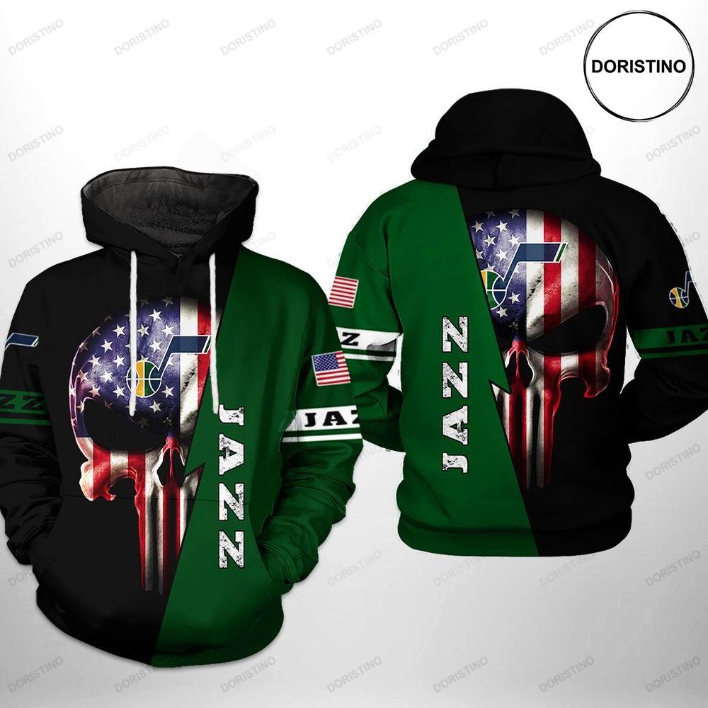 NBA Utah Jazz Green US Flag Skull Pullover Hoodie Product Features Along with its Utah Jazz graphics, this cozy pullover hoodie features super-soft midweight material. Material: 95% polyester + 5% spandex. The fabric is durable and resistant to wrinkles, shrinking and mildew. Hood with drawstrings. Long sleeve. Front pouch pocket. Midweight hoodie suitable for moderate...