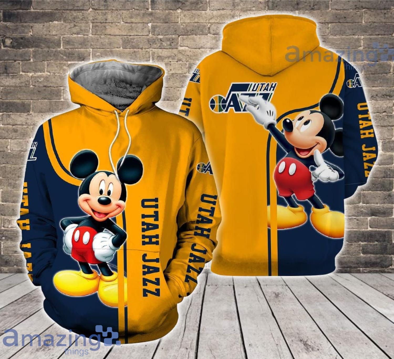 NBA Utah Jazz Mickey Pullover Hoodie Product Features Along with its Utah Jazz graphics, this cozy pullover hoodie features super-soft midweight material. Material: 95% polyester + 5% spandex. The fabric is durable and resistant to wrinkles, shrinking and mildew. Hood with drawstrings. Long sleeve. Front pouch pocket. Midweight hoodie suitable for moderate temperatures. Features a...