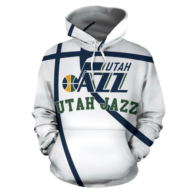 NBA Utah Jazz White Pullover Hoodie Product Features Along with its Utah Jazz graphics, this cozy pullover hoodie features super-soft midweight material. Material: 95% polyester + 5% spandex. The fabric is durable and resistant to wrinkles, shrinking and mildew. Hood with drawstrings. Long sleeve. Front pouch pocket. Midweight hoodie suitable for moderate temperatures. Features a...