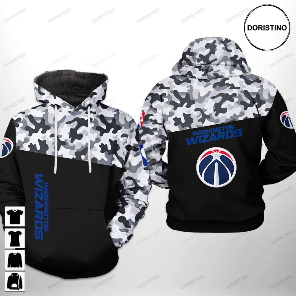 NBA Washington Wizards Camo Veteran Pullover Hoodie Product Features Along with its Washington Wizards graphics, this cozy pullover hoodie features super-soft midweight material. Material: 95% polyester + 5% spandex. The fabric is durable and resistant to wrinkles, shrinking and mildew. Hood with drawstrings. Long sleeve. Front pouch pocket. Midweight hoodie suitable for moderate temperatures. Features...