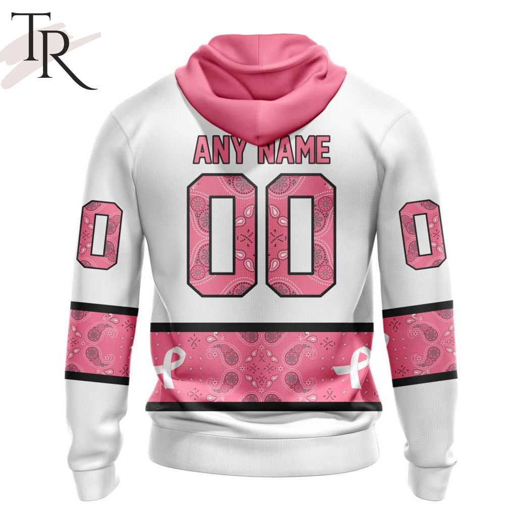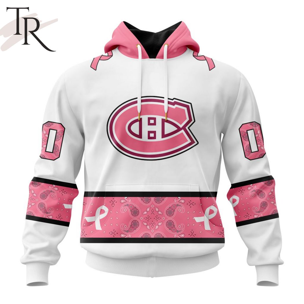 This stylish NEW Personalized NHL Montreal Canadiens In Classic Style With Paisley! IN OCTOBER WE WEAR PINK BREAST CANCER Hoodie is the perfect way for Montreal Canadiens hockey fans to show their team pride. The outfit features a graphic of the team logo on the front with a contemporary paisley pattern in classic professional NHL colours. The hoodie is made of a comfortable cotton/polyester blend for all-day comfort and style. It is designed with convenient side pockets for carrying small items and a draw-string closure for a snug fit. The pocket of the hoodie features a pink ribbon logo in support of Breast Cancer Awareness Month in October for a cause that sports fans everywhere can proudly support. This hoodie is a stylish, comfortable way to show support for the Montreal Canadiens and Breast Cancer Awareness Month.