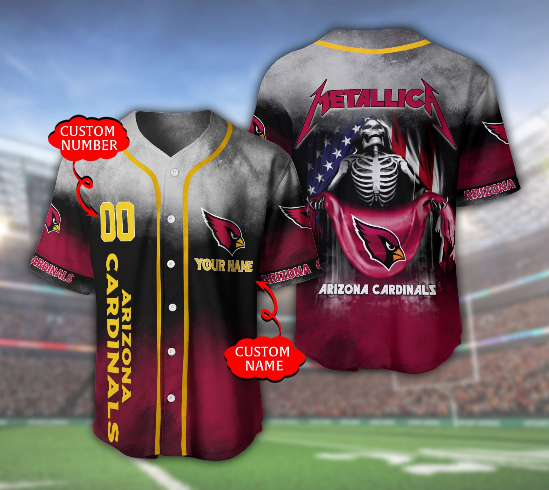 NFL Arizona Cardinals Custom Name Number Skull Baseball Jersey Product Features This Arizona Cardinals Baseball Jersey is not only sturdy and durable for long hours of exercising, but also breathable and moisture-wicking to keep you snug all day. Breathable fabric: This Baseball Jersey is made of woven fabric, with moisture-wicking features and a comfortable feel...