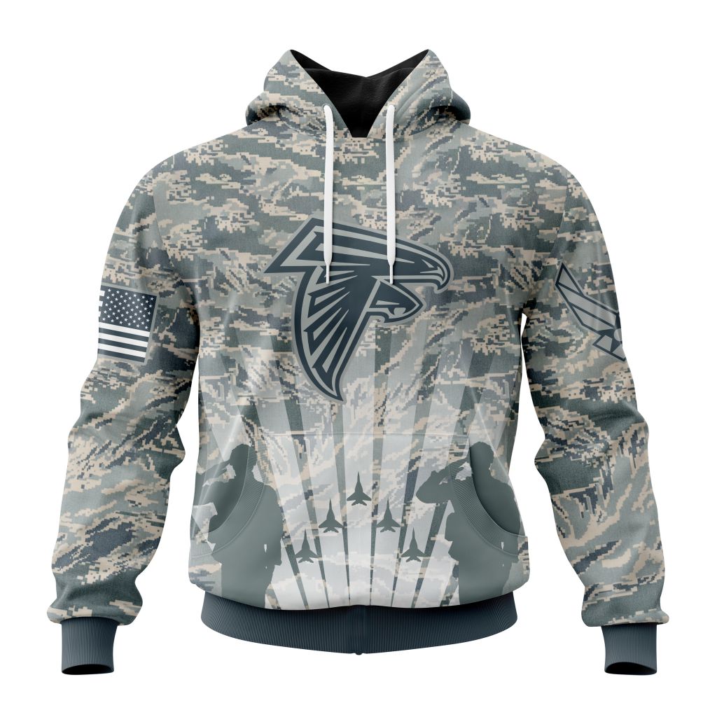 NFL Atlanta Falcons Custom Name Number US Air Force Veterans Pullover Hoodie Product Features Along with its Atlanta Falcons graphics, this cozy pullover hoodie features super-soft midweight material. Material: 95% polyester + 5% spandex. The fabric is durable and resistant to wrinkles, shrinking and mildew. Hood with drawstrings. Long sleeve. Front pouch pocket. Midweight hoodie...