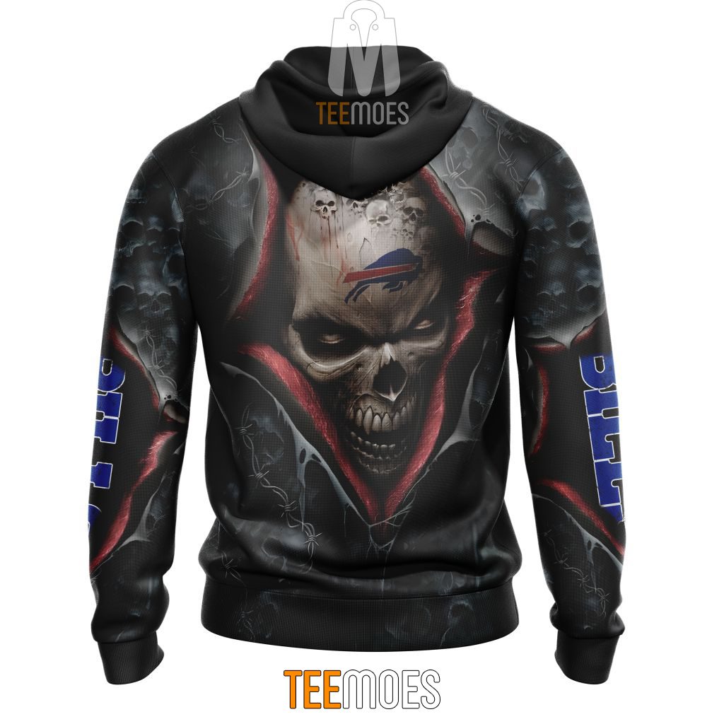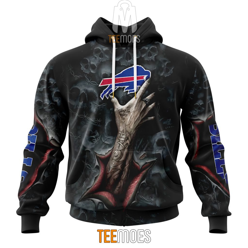 NFL Buffalo Bills Halloween Horror Skull Pullover Hoodie Product Features Along with its Buffalo Bills graphics, this cozy pullover hoodie features super-soft midweight material. Material: 95% polyester + 5% spandex. The fabric is durable and resistant to wrinkles, shrinking and mildew. Hood with drawstrings. Long sleeve. Front pouch pocket. Midweight hoodie suitable for moderate temperatures....