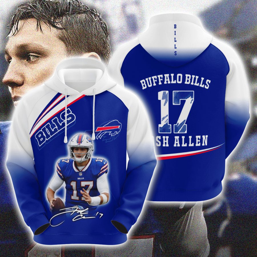 NFL Buffalo Bills Josh Allen Blue White Pullover Hoodie Product Features Along with its Buffalo Bills graphics, this cozy pullover hoodie features super-soft midweight material. Material: 95% polyester + 5% spandex. The fabric is durable and resistant to wrinkles, shrinking and mildew. Hood with drawstrings. Long sleeve. Front pouch pocket. Midweight hoodie suitable for moderate...