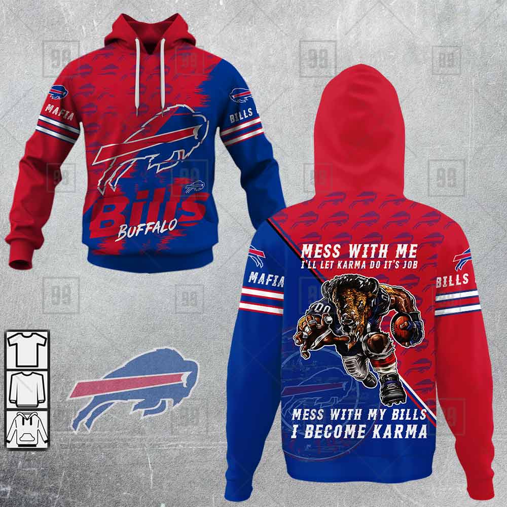 NFL Buffalo Bills Royal Red Mafia Mess Pullover Hoodie Product Features Along with its Buffalo Bills graphics, this cozy pullover hoodie features super-soft midweight material. Material: 95% polyester + 5% spandex. The fabric is durable and resistant to wrinkles, shrinking and mildew. Hood with drawstrings. Long sleeve. Front pouch pocket. Midweight hoodie suitable for moderate...
