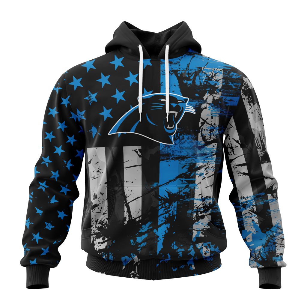 NFL Carolina Panthers Custom Name Number Classic Grunge American Flag Pullover Hoodie Product Features Along with its Carolina Panthers graphics, this cozy pullover hoodie features super-soft midweight material. Material: 95% polyester + 5% spandex. The fabric is durable and resistant to wrinkles, shrinking and mildew. Hood with drawstrings. Long sleeve. Front pouch pocket. Midweight hoodie...