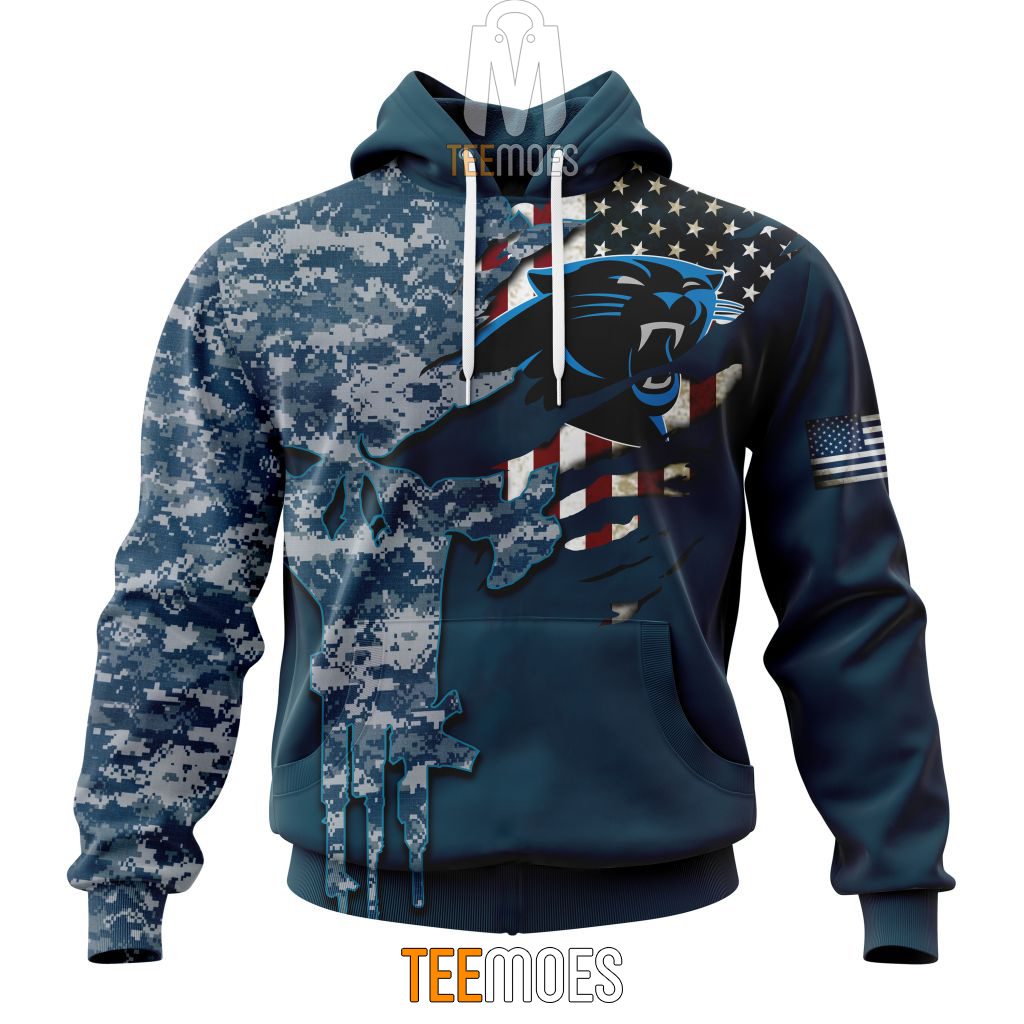 NFL Carolina Panthers Custom Name Number Navy Skull Camo Veteran Pullover Hoodie Product Features Along with its Carolina Panthers graphics, this cozy pullover hoodie features super-soft midweight material. Material: 95% polyester + 5% spandex. The fabric is durable and resistant to wrinkles, shrinking and mildew. Hood with drawstrings. Long sleeve. Front pouch pocket. Midweight hoodie...