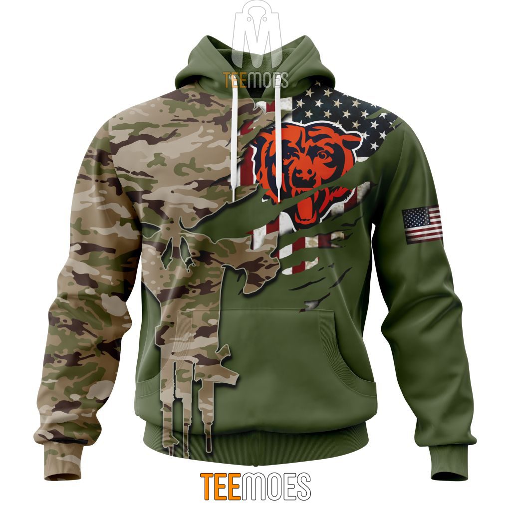NFL Chicago Bears Custom Name Number Green Camo US Military Pullover Hoodie Product Features Along with its Chicago Bears graphics, this cozy pullover hoodie features super-soft midweight material. Material: 95% polyester + 5% spandex. The fabric is durable and resistant to wrinkles, shrinking and mildew. Hood with drawstrings. Long sleeve. Front pouch pocket. Midweight hoodie...