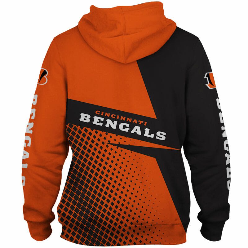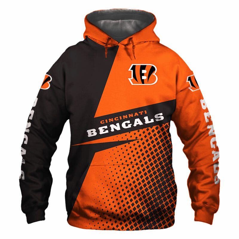 NFL Cincinnati Bengals Orange Black Pullover Hoodie V2 Product Features Along with its Cincinnati Bengals graphics, this cozy pullover hoodie features super-soft midweight material. Material: 95% polyester + 5% spandex. The fabric is durable and resistant to wrinkles, shrinking and mildew. Hood with drawstrings. Long sleeve. Front pouch pocket. Midweight hoodie suitable for moderate temperatures....