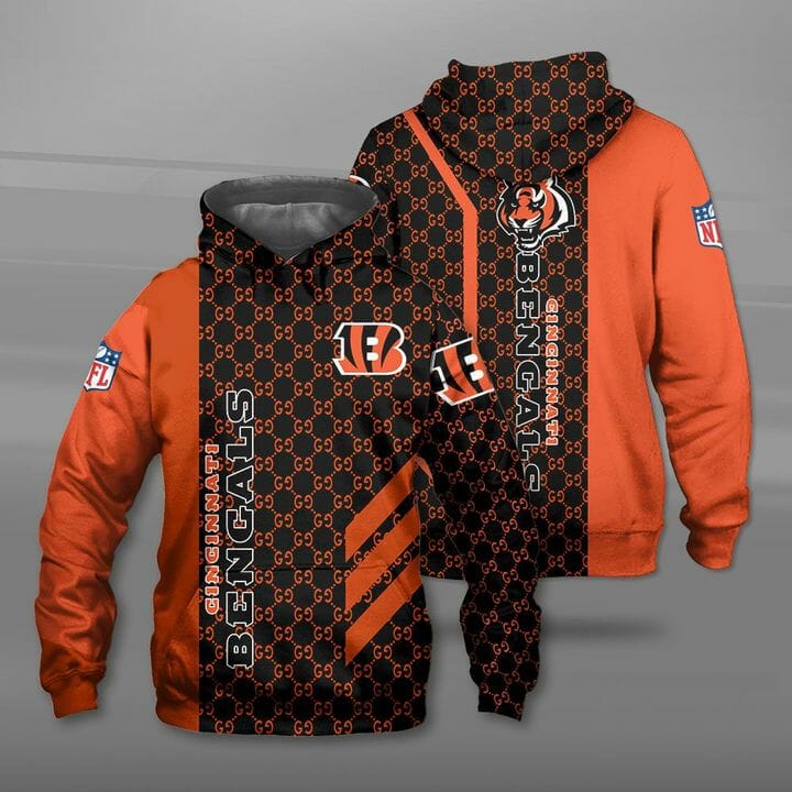 NFL Cincinnati Bengals Orange Black Pullover Hoodie V9 Product Features Along with its Cincinnati Bengals graphics, this cozy pullover hoodie features super-soft midweight material. Material: 95% polyester + 5% spandex. The fabric is durable and resistant to wrinkles, shrinking and mildew. Hood with drawstrings. Long sleeve. Front pouch pocket. Midweight hoodie suitable for moderate temperatures....