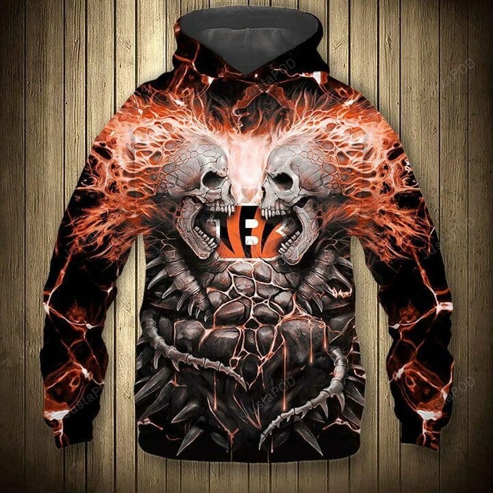 NFL Cincinnati Bengals Skull Orange Black Pullover Hoodie V5 Product Features Along with its Cincinnati Bengals graphics, this cozy pullover hoodie features super-soft midweight material. Material: 95% polyester + 5% spandex. The fabric is durable and resistant to wrinkles, shrinking and mildew. Hood with drawstrings. Long sleeve. Front pouch pocket. Midweight hoodie suitable for moderate...
