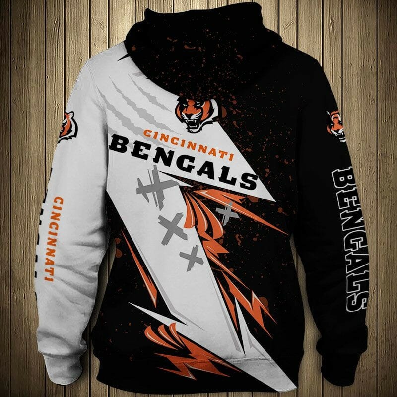 NFL Cincinnati Bengals Thunder Black White Pullover Hoodie Product Features Along with its Cincinnati Bengals graphics, this cozy pullover hoodie features super-soft midweight material. Material: 95% polyester + 5% spandex. The fabric is durable and resistant to wrinkles, shrinking and mildew. Hood with drawstrings. Long sleeve. Front pouch pocket. Midweight hoodie suitable for moderate temperatures....