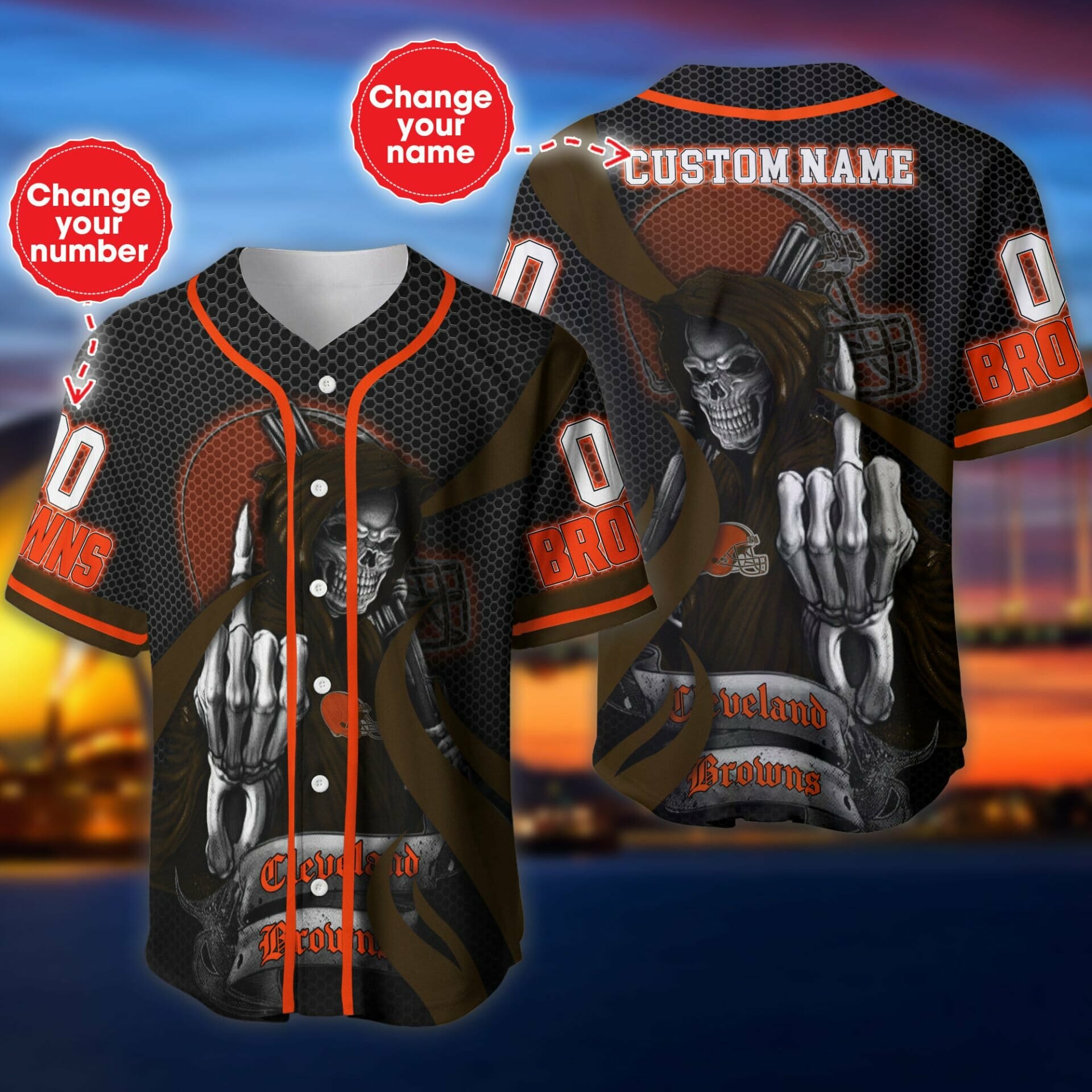 NFL Cleveland Browns Custom Name Number Skull Baseball Jersey Product Features This Cleveland Browns Baseball Jersey is not only sturdy and durable for long hours of exercising, but also breathable and moisture-wicking to keep you snug all day. Breathable fabric: This Baseball Jersey is made of woven fabric, with moisture-wicking features and a comfortable feel...