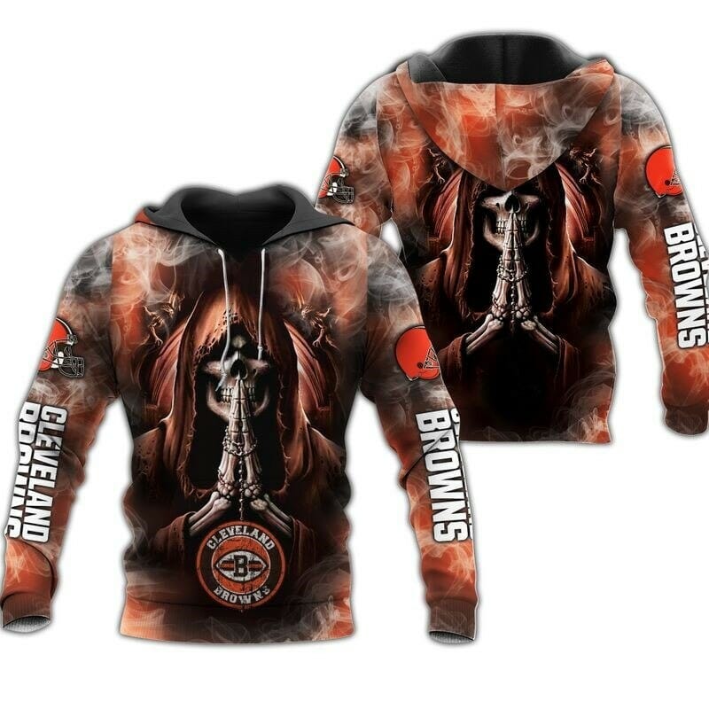 NFL Cleveland Browns Skull Smoke Pullover Hoodie Product Features Along with its Cleveland Browns graphics, this cozy pullover hoodie features super-soft midweight material. Material: 95% polyester + 5% spandex. The fabric is durable and resistant to wrinkles, shrinking and mildew. Hood with drawstrings. Long sleeve. Front pouch pocket. Midweight hoodie suitable for moderate temperatures. Features...