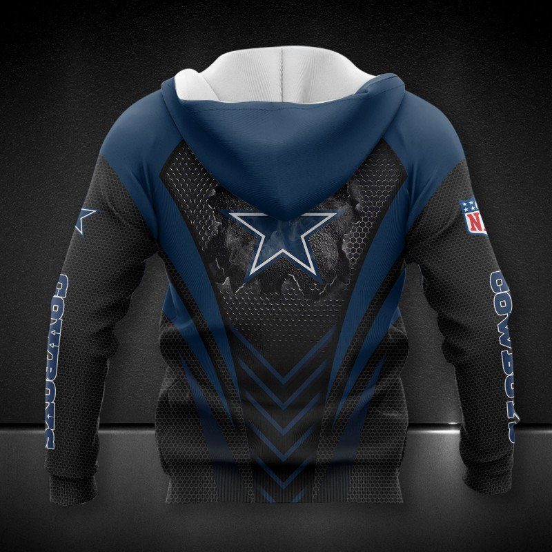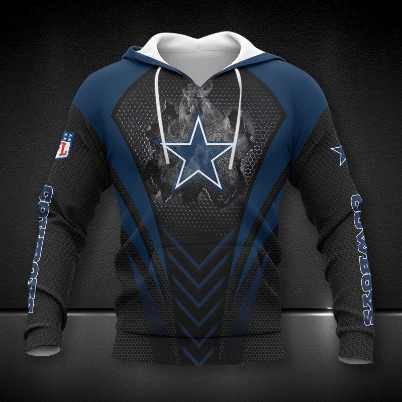 NFL Dallas Cowboys Black Blue Darken Logo Burning Pullover Hoodie Product Features Along with its Dallas Cowboys graphics, this cozy pullover hoodie features super-soft midweight material. Material: 95% polyester + 5% spandex. The fabric is durable and resistant to wrinkles, shrinking and mildew. Hood with drawstrings. Long sleeve. Front pouch pocket. Midweight hoodie suitable for...