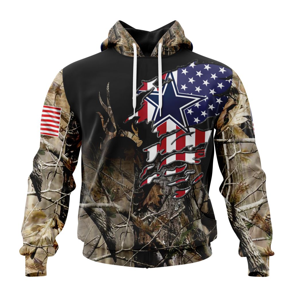 NFL Dallas Cowboys Custom Name Number Camo Realtree Hunting Pullover Hoodie Product Features Along with its Dallas Cowboys graphics, this cozy pullover hoodie features super-soft midweight material. Material: 95% polyester + 5% spandex. The fabric is durable and resistant to wrinkles, shrinking and mildew. Hood with drawstrings. Long sleeve. Front pouch pocket. Midweight hoodie suitable...