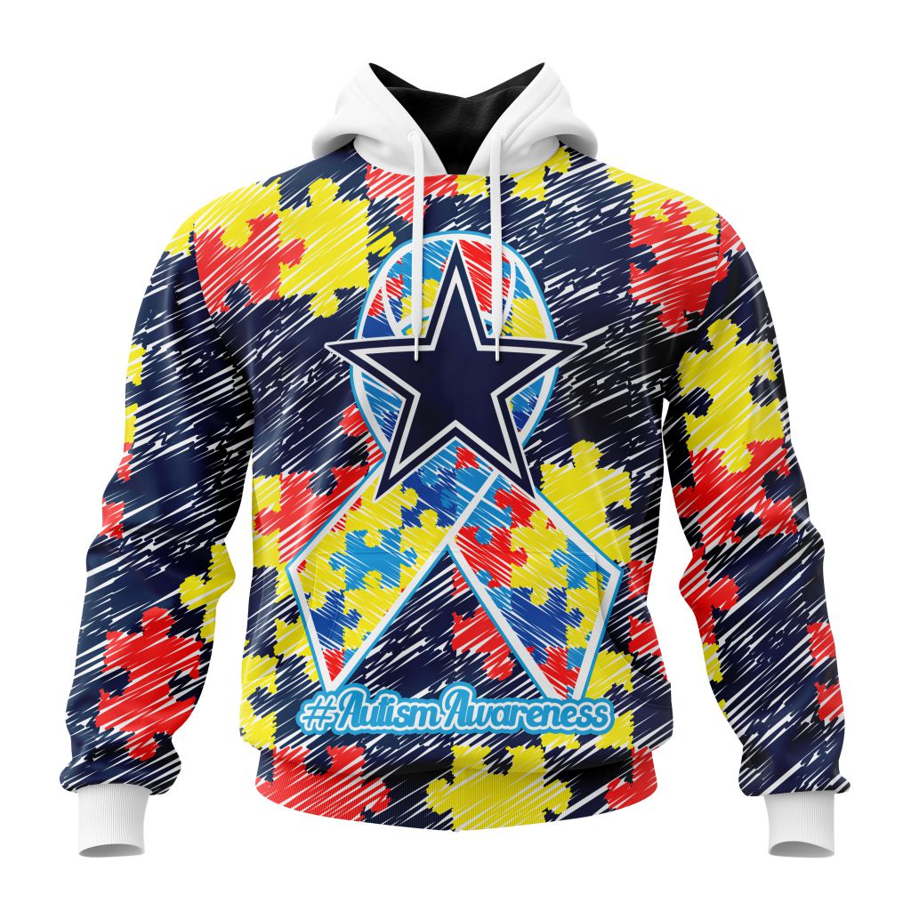 NFL Dallas Cowboys Custom Name Number Puzzle Autism Awareness Pullover Hoodie Product Features Along with its Dallas Cowboys graphics, this cozy pullover hoodie features super-soft midweight material. Material: 95% polyester + 5% spandex. The fabric is durable and resistant to wrinkles, shrinking and mildew. Hood with drawstrings. Long sleeve. Front pouch pocket. Midweight hoodie suitable...
