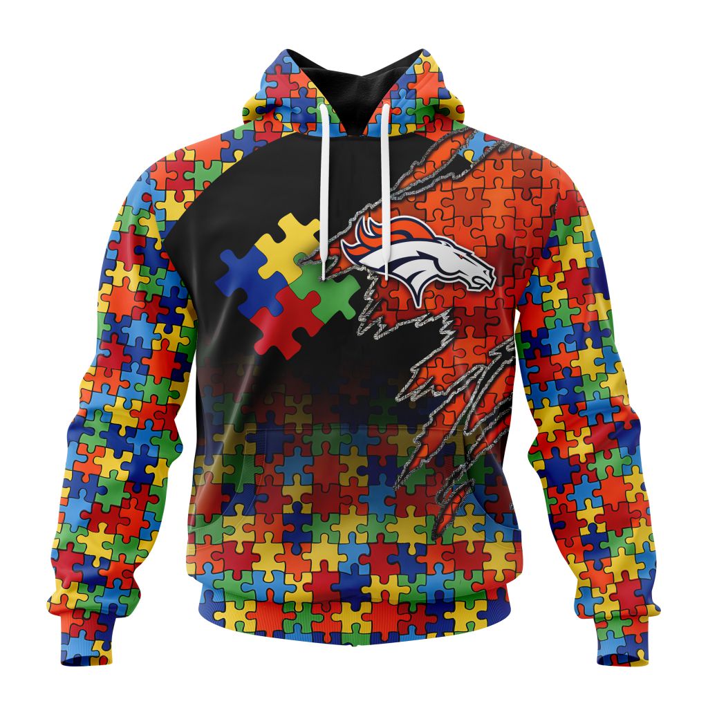 NFL Denver Broncos Custom Name Number Autism Awareness Design Pullover Hoodie Product Features Along with its Denver Broncos graphics, this cozy pullover hoodie features super-soft midweight material. Material: 95% polyester + 5% spandex. The fabric is durable and resistant to wrinkles, shrinking and mildew. Hood with drawstrings. Long sleeve. Front pouch pocket. Midweight hoodie suitable...