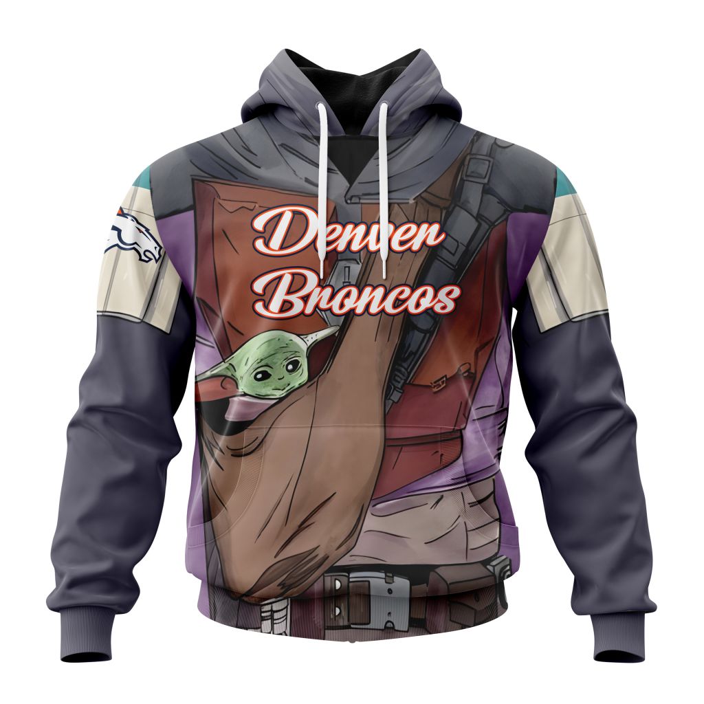 NFL Denver Broncos Custom Name Number Mandalorian And Baby Yoda Pullover Hoodie Product Features Along with its Denver Broncos graphics, this cozy pullover hoodie features super-soft midweight material. Material: 95% polyester + 5% spandex. The fabric is durable and resistant to wrinkles, shrinking and mildew. Hood with drawstrings. Long sleeve. Front pouch pocket. Midweight hoodie...