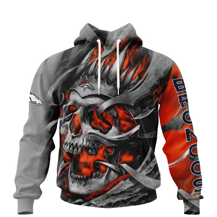 NFL Denver Broncos Custom Name Number Skull Orange Grey Pullover Hoodie Product Features Along with its Denver Broncos graphics, this cozy pullover hoodie features super-soft midweight material. Material: 95% polyester + 5% spandex. The fabric is durable and resistant to wrinkles, shrinking and mildew. Hood with drawstrings. Long sleeve. Front pouch pocket. Midweight hoodie suitable...