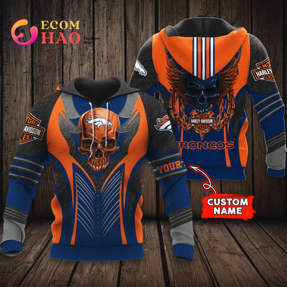 NFL Denver Broncos Custom Name Skull Orange Blue Pullover Hoodie V2 Product Features Along with its Denver Broncos graphics, this cozy pullover hoodie features super-soft midweight material. Material: 95% polyester + 5% spandex. The fabric is durable and resistant to wrinkles, shrinking and mildew. Hood with drawstrings. Long sleeve. Front pouch pocket. Midweight hoodie suitable...