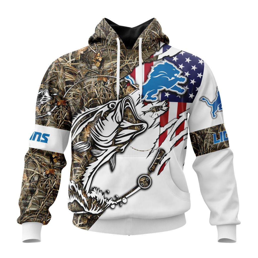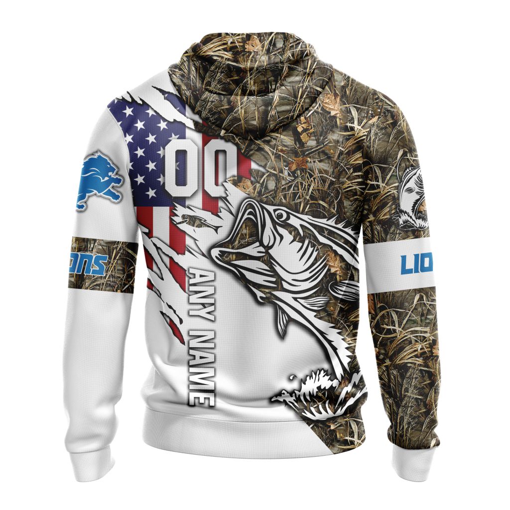 NFL Detroit Lions Custom Name Number Fishing With Flag Of USA Pullover Hoodie Product Features Along with its Detroit Lions graphics, this cozy pullover hoodie features super-soft midweight material. Material: 95% polyester + 5% spandex. The fabric is durable and resistant to wrinkles, shrinking and mildew. Hood with drawstrings. Long sleeve. Front pouch pocket. Midweight...