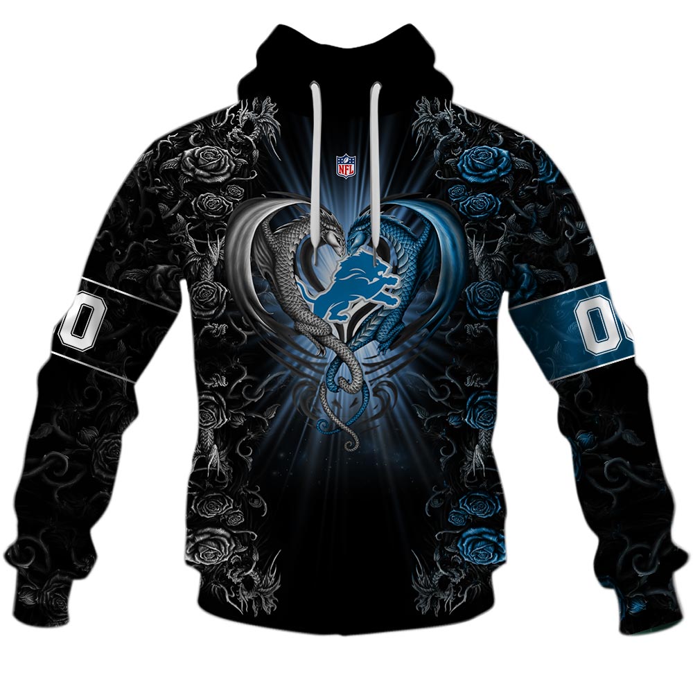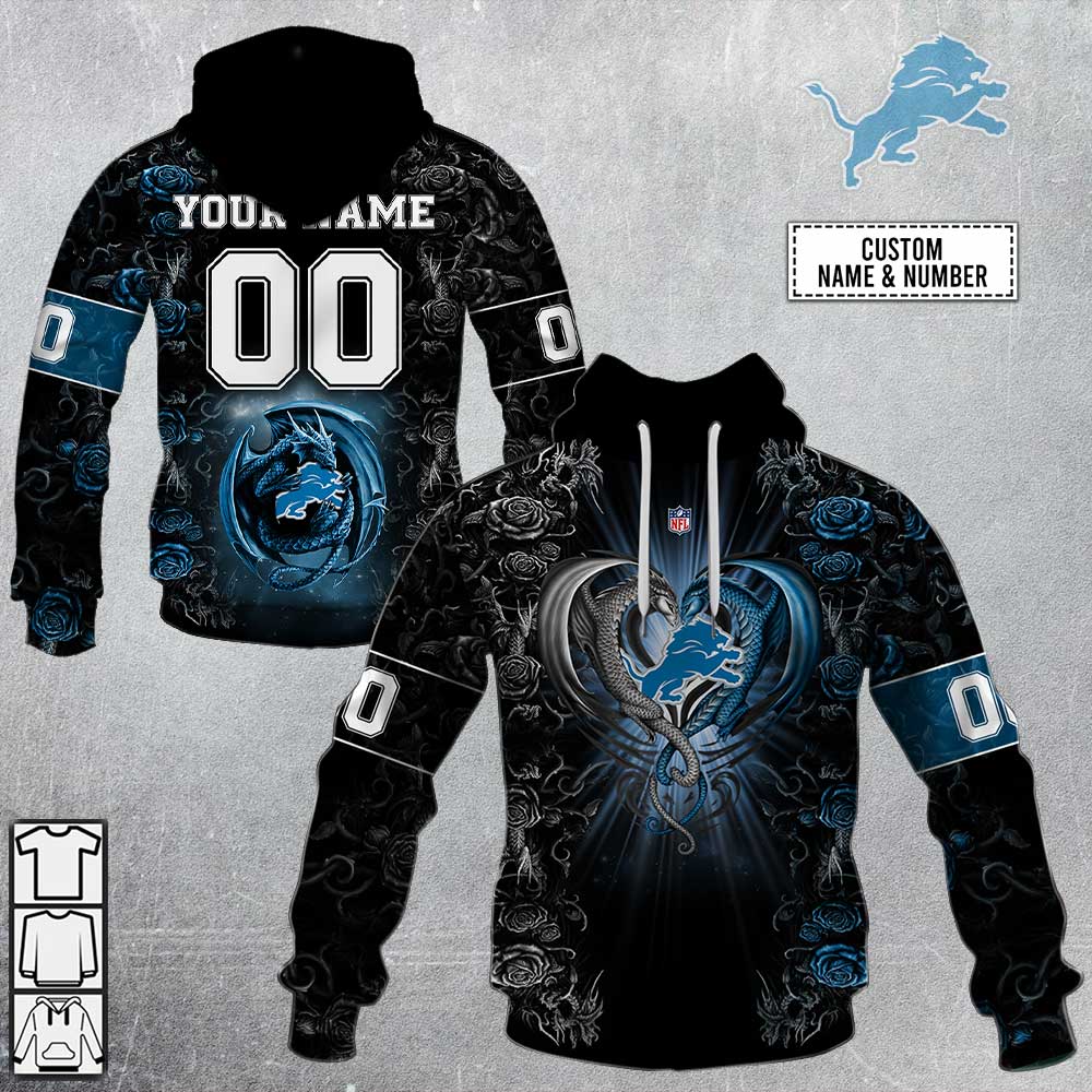 NFL Detroit Lions Custom Name Number Rose Dragon Pullover Hoodie Product Features Along with its Detroit Lions graphics, this cozy pullover hoodie features super-soft midweight material. Material: 95% polyester + 5% spandex. The fabric is durable and resistant to wrinkles, shrinking and mildew. Hood with drawstrings. Long sleeve. Front pouch pocket. Midweight hoodie suitable for...